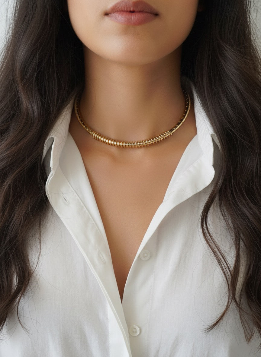 The Aiko necklace is a refined choker-style piece crafted in lustrous gold, designed to sit elegantly at the base of the neck. This versatile accessory combines contemporary minimalism with timeless appeal, making it an essential addition to both everyday wear and special occasion collections.