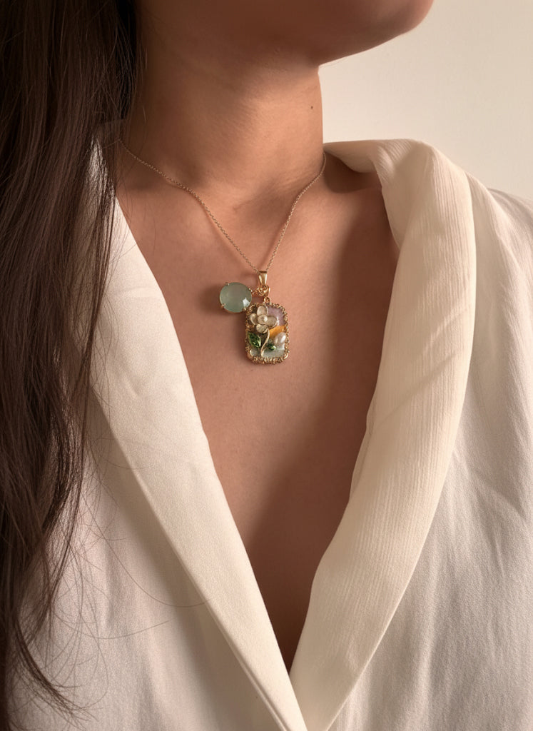 Experience the allure of the Hanga pendant, where meticulous craftsmanship meets wearable art. This exquisite piece showcases hand-painted enamel detailing that brings character and depth, beautifully complemented by the rich, captivating presence of blue onyx stone. Set in warm gold tones, this pendant creates a harmonious balance that enhances any complexion and style.