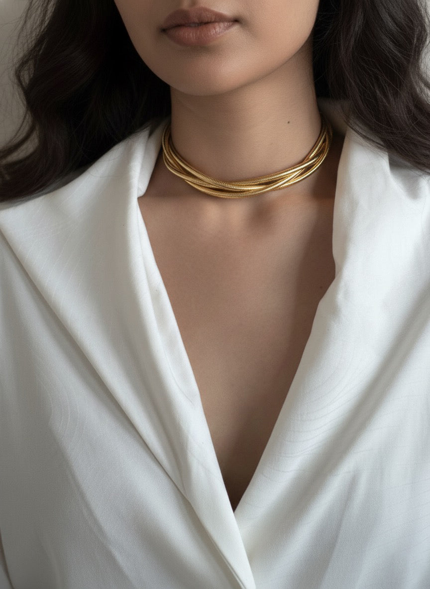 The Haruka necklace redefines versatility with its elegant dual-metal choker design featuring complementary gold finishes. This beautifully balanced piece adapts to your unique style, whether you prefer warm or cool tones—or want both. The choker fit flatters the neckline with understated glamour.