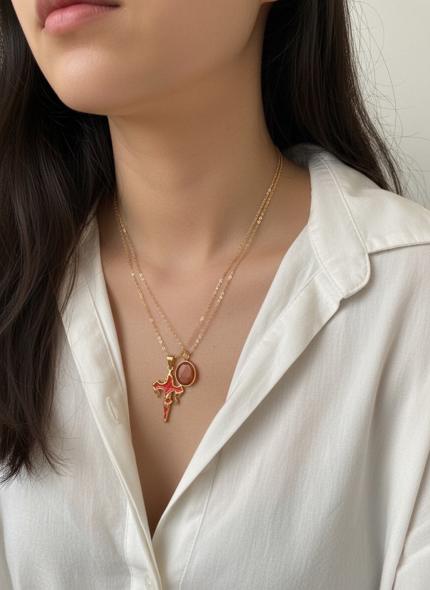 Elevate your style with the Sora pendant, a captivating blend of natural beauty and artistic design. The luminous citrine stone radiates warmth and positive energy, while the hand-painted enamel cross adds an exclusive, handcrafted touch that sets you apart. Set in elegant gold-tone metal, this pendant becomes an instant statement piece that draws admiration and conversation.